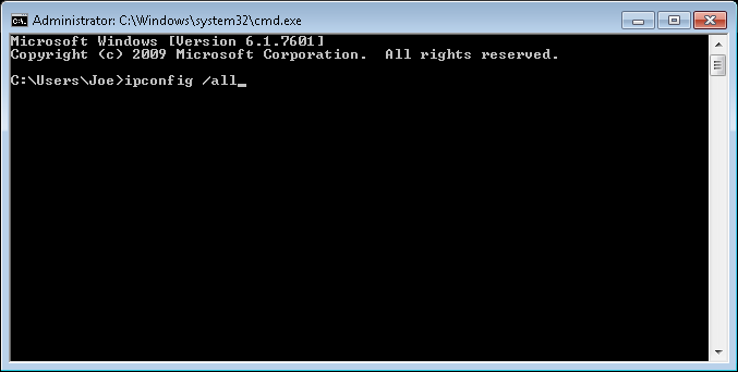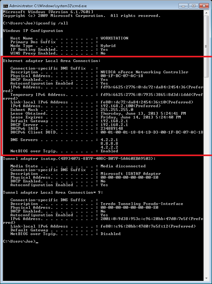 Step 3: Type ipconfig /all into the black box window and click OK. A bunch of information should get spit out. We are looking for the section that I’ve boxed off in red below. In my case I’ve identified it because it actually has an IP address assignment, gateway information and DNS information – a disconnected network interface will probably not have that information or it will say Media disconnected as a Media State status.
