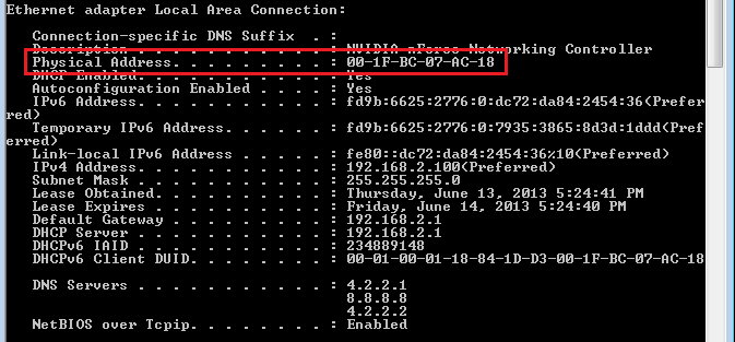 The physical address or MAC Address should be 6 sets of 2 characters each separated by a hyphen. This is the information you will have to feed your router to give your computer’s MAC address priority over all others. Some routers require it to use colons (:) instead of hyphens and other routers provide 6 separate text boxes for each pair of characters. It will be made clear to you when you set this up.