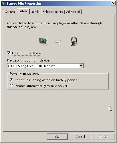 Double-click on Stereo Mix. This will open the stereo mix properties window. Click the Listen tab. Check the box next to Listen to this device. In the drop-down box below, select your USB Headset. In this case it is my Logitech G930 Headset. See the image below as a reference.