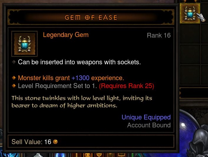 I had a Gem of Ease so my goal was to run that as soon as I could equip it and then run the hardest difficulty that I could power through. My Gem of Ease wasn’t rank 25 so I had to wait until about level 17 to find or craft or enchant a socketed weapon in which to equip the legendary gem.