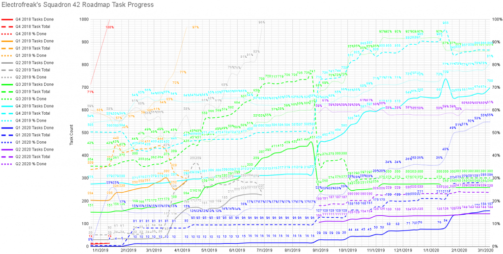 This graph takes the data ultimately pulled from the Squadron 42 roadmap to give us a look at progress on a week-by-week basis over the course of roughly 15 months. (January 1st, 2019 through March 6th, 2020) The dashed lines are the total tasks for a certain release, the dotted lines are the percentage of tasks completed for a certain release and the solid lines are tasks completed for a certain release. Colors differentiate between the different releases.